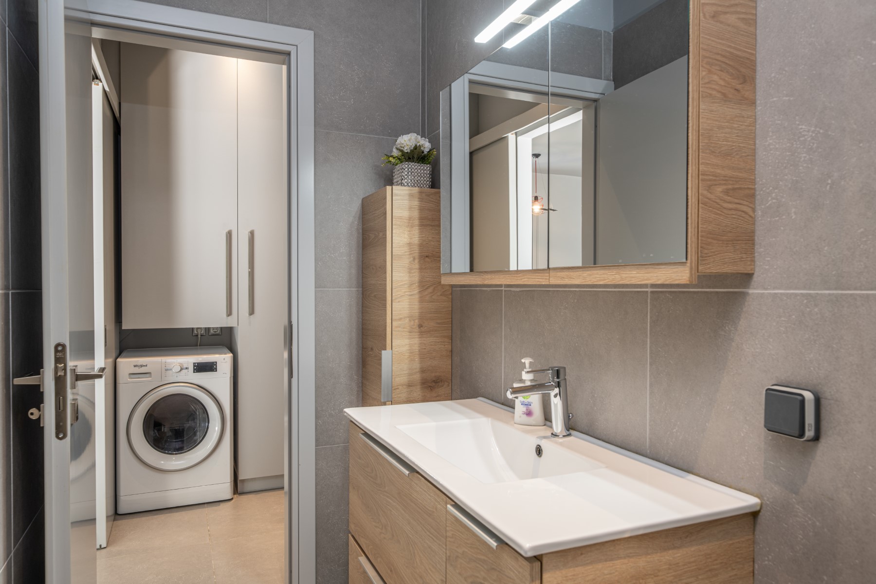 From the moment you step inside, you’ll feel at ease. The open-plan layout includes a fully equipped kitchen where you can prepare your favorite meals, and a cozy living area with a plush sofa. Whether you're streaming a movie, enjoying your favorite tunes on the high-quality SONOS soundbar or JBL Bluetooth speaker, or catching up on emails at the clever built-in workspace (complete with a PC screen), every detail is designed for comfort and convenience.